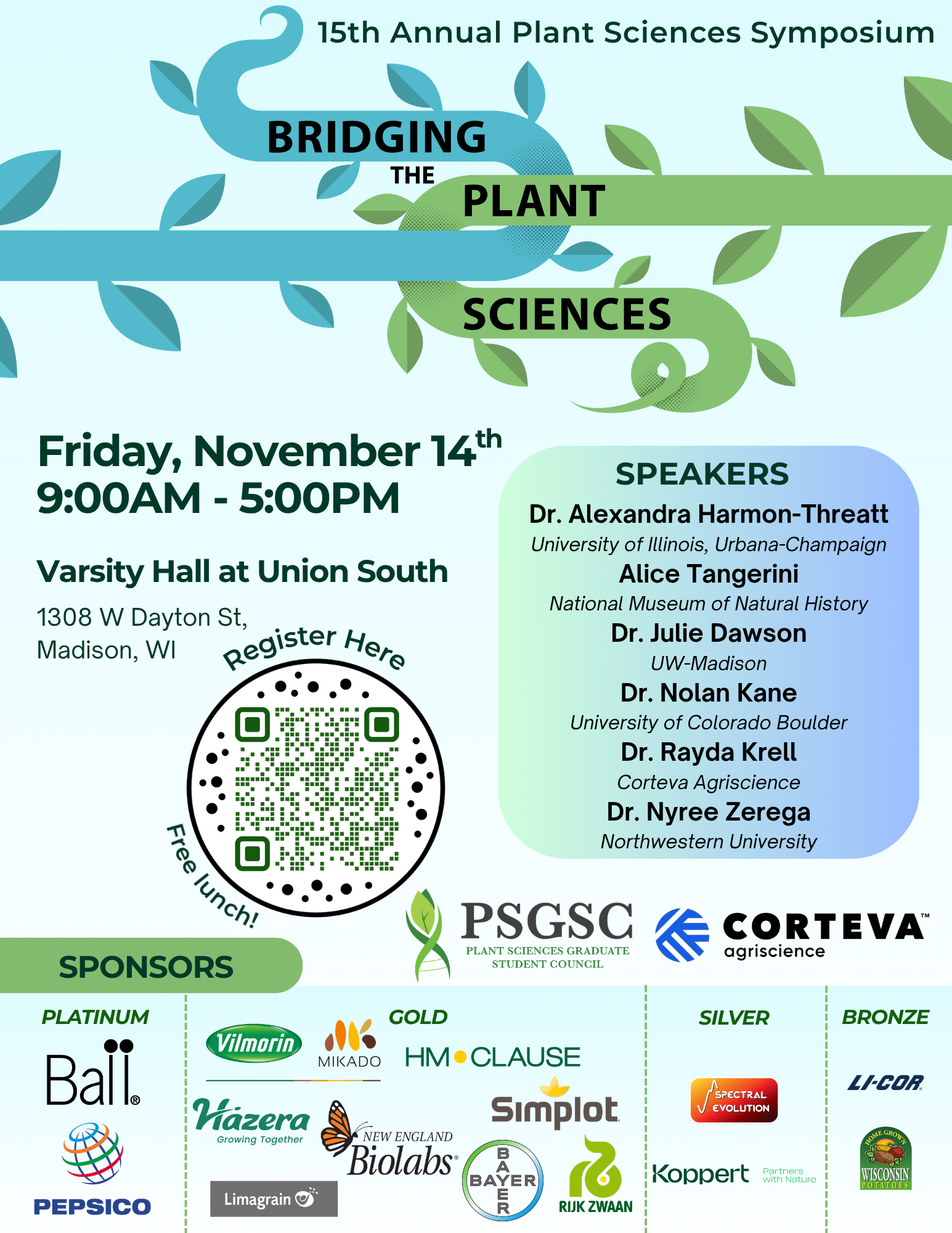 The UW – Madison Plant Sciences Graduate Student Council (PSGSC) is excited to host our 15th Annual Plant Sciences Symposium on Friday, November 14th from 9AM – 4:30PM at the Varsity Hall I & II of Union South Discovery Building on UW – Madison’s campus.